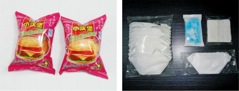 主要适用于包装各类不规则物品、粘性固体物品的包装。例如食品类:果脯,香肠,鱿 鱼,蛋糕,蛋卷、速食面、果冻、软糖等;其它类:毛巾,湿巾,套装牙膏牙刷等酒店 用品、胶带、五金件,袖珍记事本、药品等。